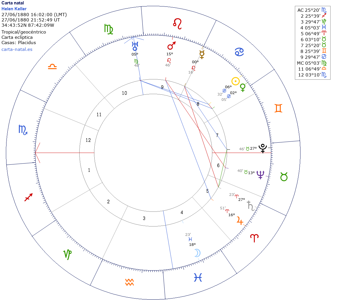 Helen Keller nació el 27 de Junio de 1880 a las 16:02:00 en Tuscumbia (Colbert AL), Estados Unidos