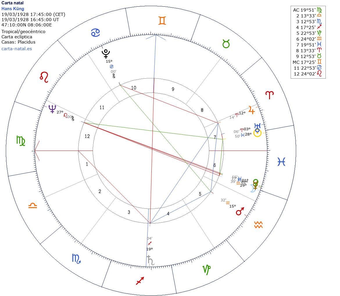 Hans Küng nació el 19 de Marzo de 1928 a las 17:45:00 en Sursee (Lucerna), Suiza