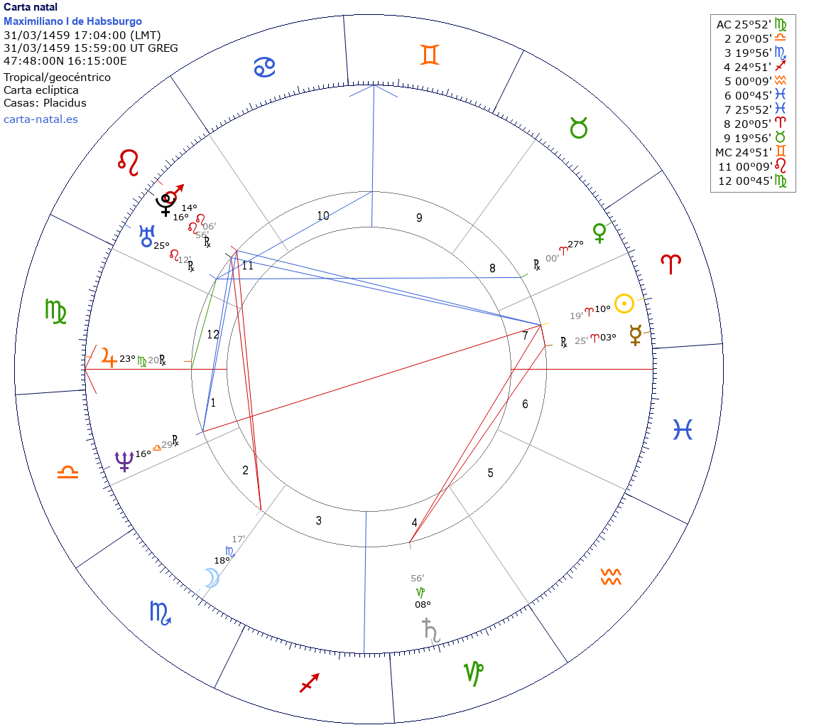 Maximiliano I de Habsburgo nació el 22 de Marzo de 1459 a las 17:04:00 en Wiener Neustadt (Lower Austria), Austria
