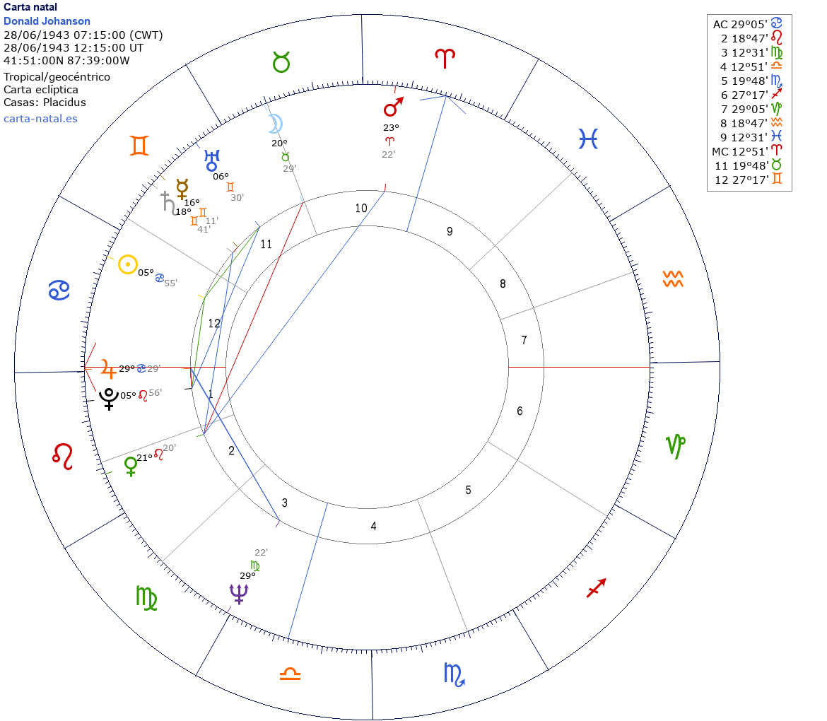 Esta es la carta natal de Donald Johanson, paleoantropólogo estadounidense.