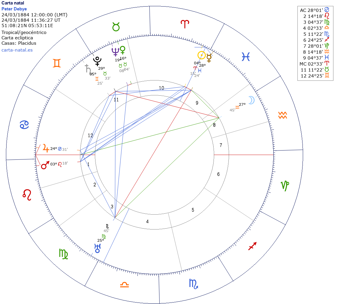 Esta es la carta natal de Peter Debye, físico-químico estadounidense de origen holandés, premio Nobel de Química en 1936.