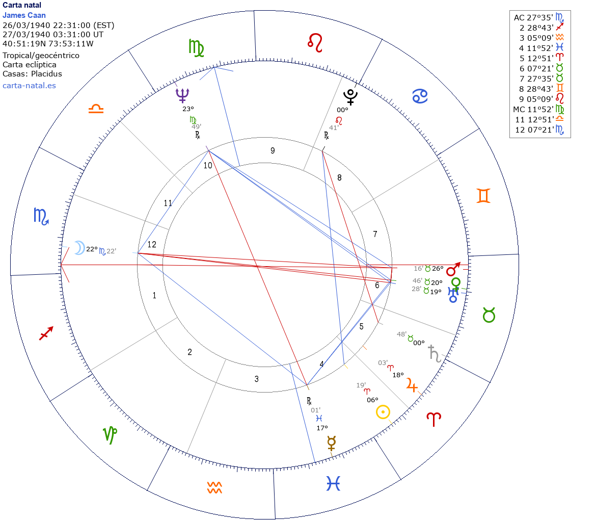 Esta es la carta natal de James Caan, actor estadounidense.
