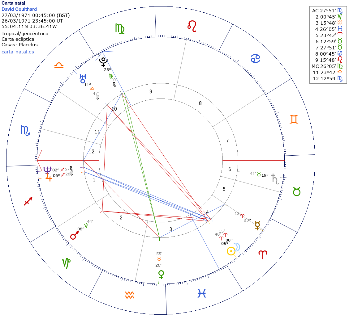 Esta es la carta natal de David Coulthard, piloto de Fórmula 1 escocés.