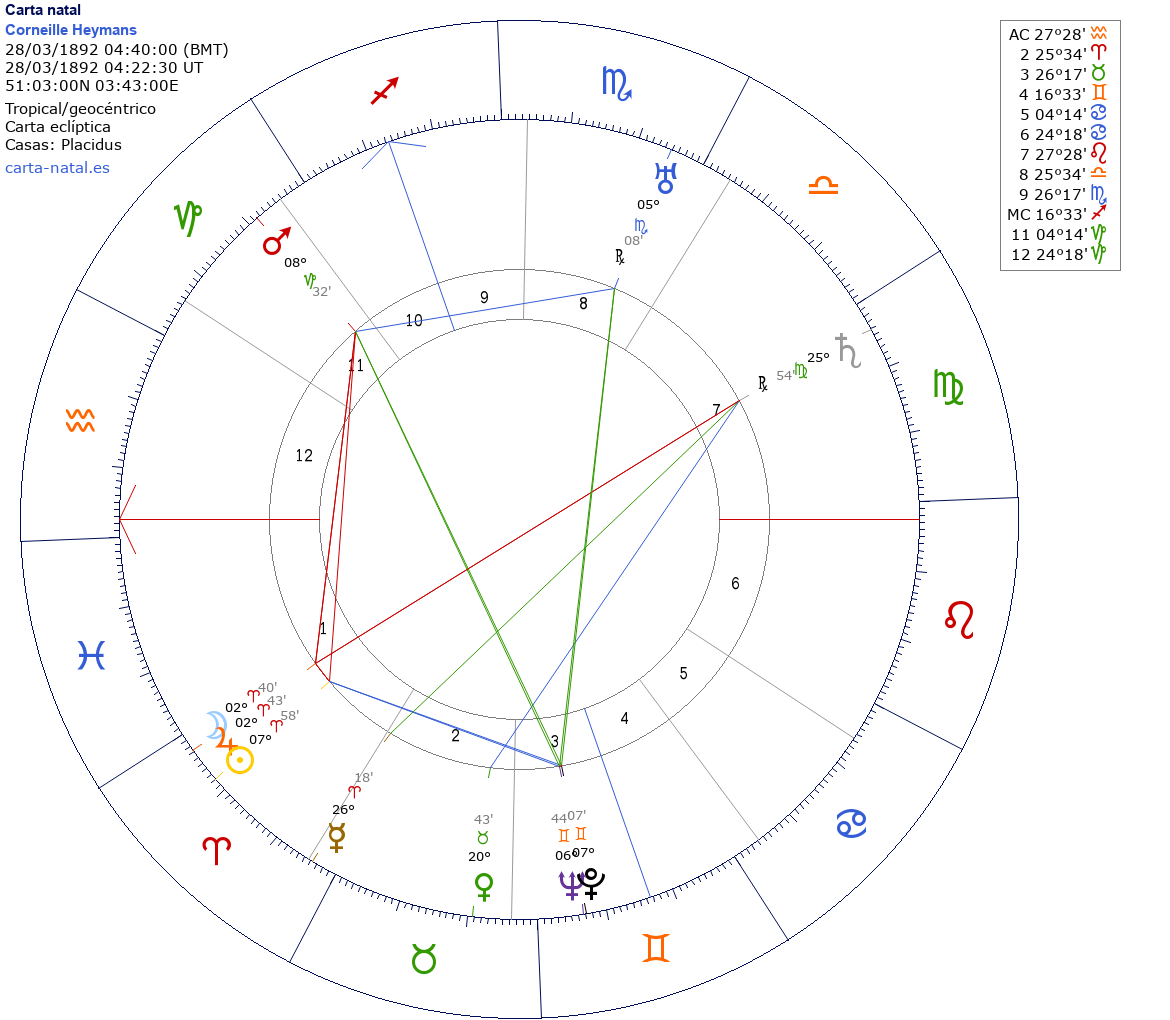 Corneille Heymans nació el 28 de Marzo de 1892 a las 04:40:00 en Gent (Flandes Oriental), Bélgica
