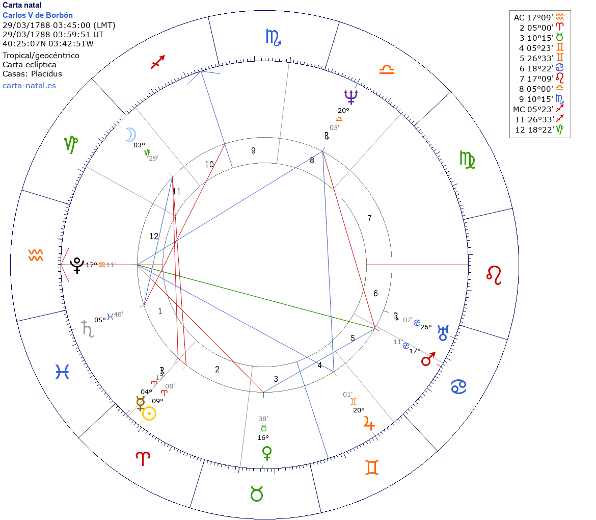 Carlos V de Borbón nació el 29 de Marzo de 1788 a las 03:45:00 en Palacio Real de Madrid (Madrid), España