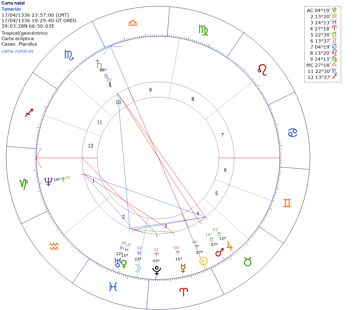 Esta es la carta natal de Tamerlán (Timur Lang o Timur el Cojo), conquistador, líder militar y político turco, Gobernante del Imperio Timúrida.