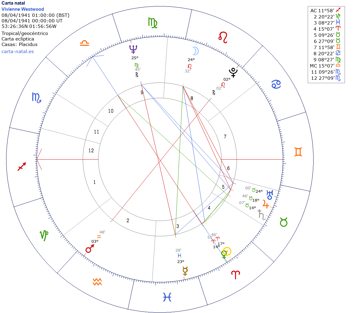 Esta es la carta natal de Vivienne Westwood, diseñadora de moda británica.