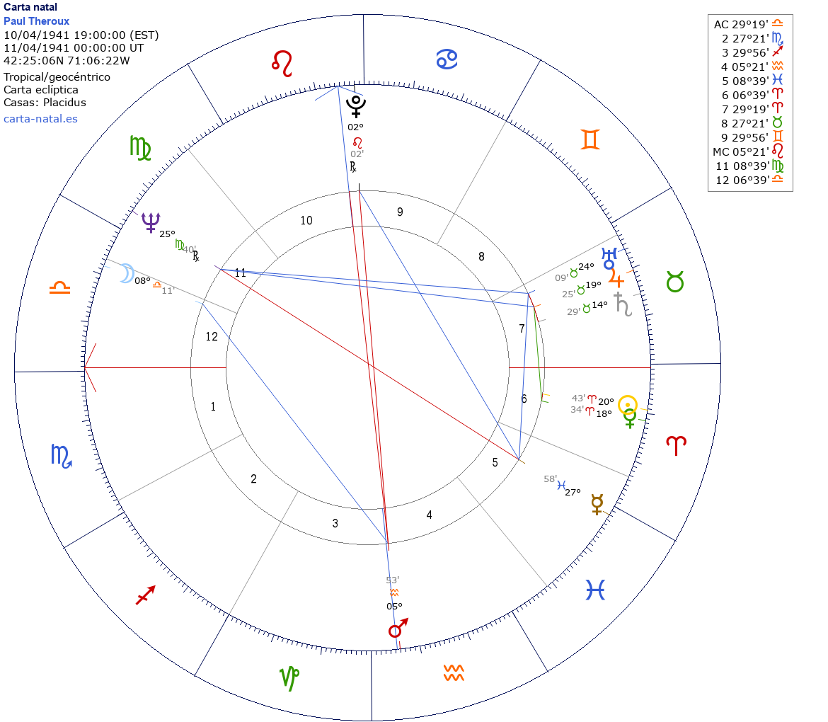 Esta es la carta natal de Paul Theroux, escritor estadounidense.