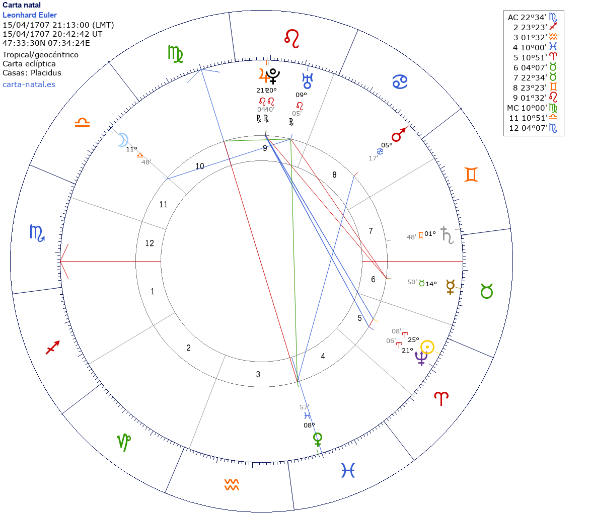 Esta es la carta natal de Leonhard Euler, matemático y físico suizo.