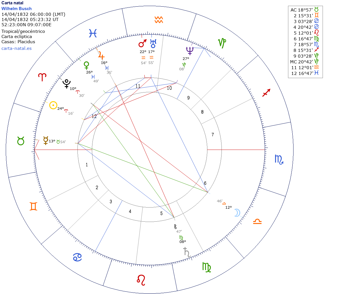 Wilhelm Busch nació el 14 de Abril de 1832 a las 06:00:00 en Wiedensahl (Baja Sajonia), Alemania