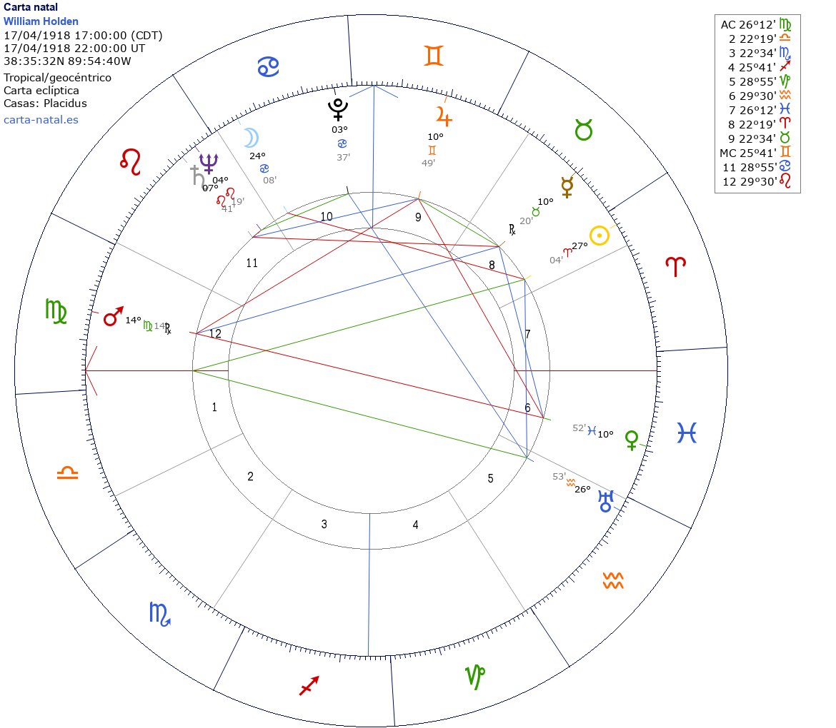 Esta es la carta natal de William Holden, actor estadounidense. (d. 1981)