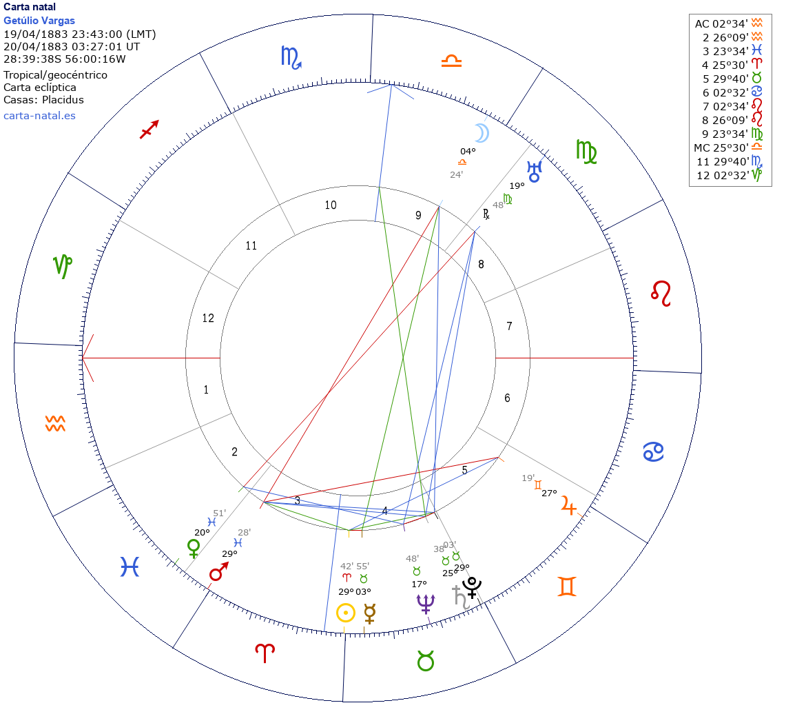 Getúlio Vargas nació el 19 de Abril de 1883 a las 23:43:00 en Sao Borja (Rio Grande do Sul), Brasil