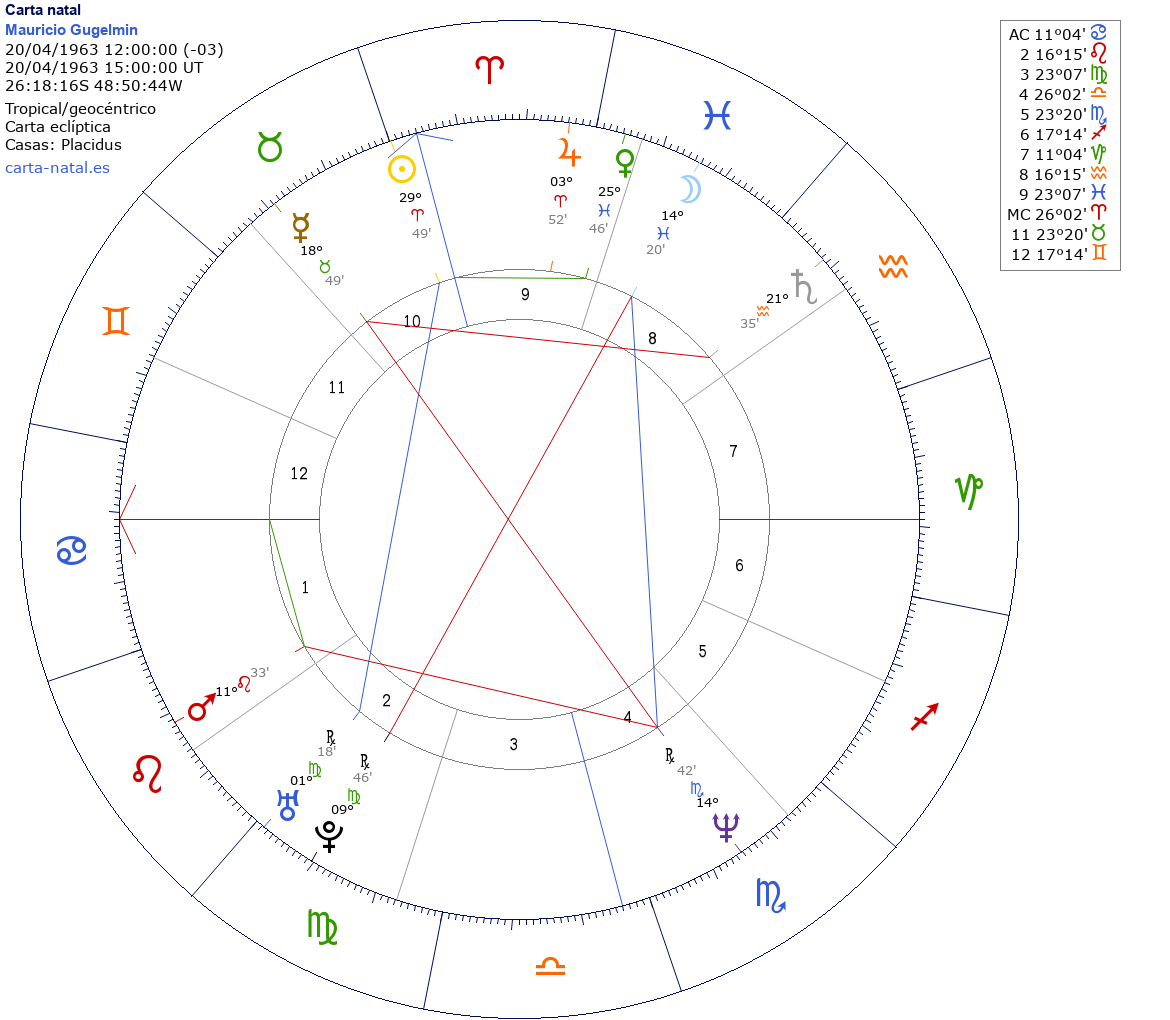 Esta es la carta natal de Mauricio Gugelmin, piloto de Fórmula 1 brasileño.