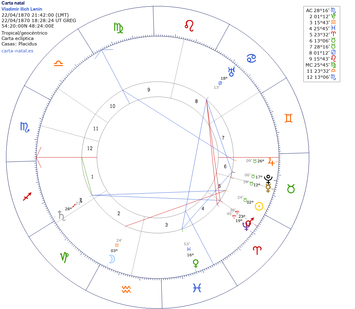 Vladímir Ilich Lenin nació el 10 de Abril de 1870 a las 21:42:00 en Ul'yanovsk (Uliánovsk), Rusia