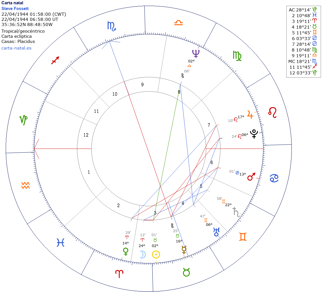 Esta es la carta natal de Steve Fossett, aventurero estadounidense.