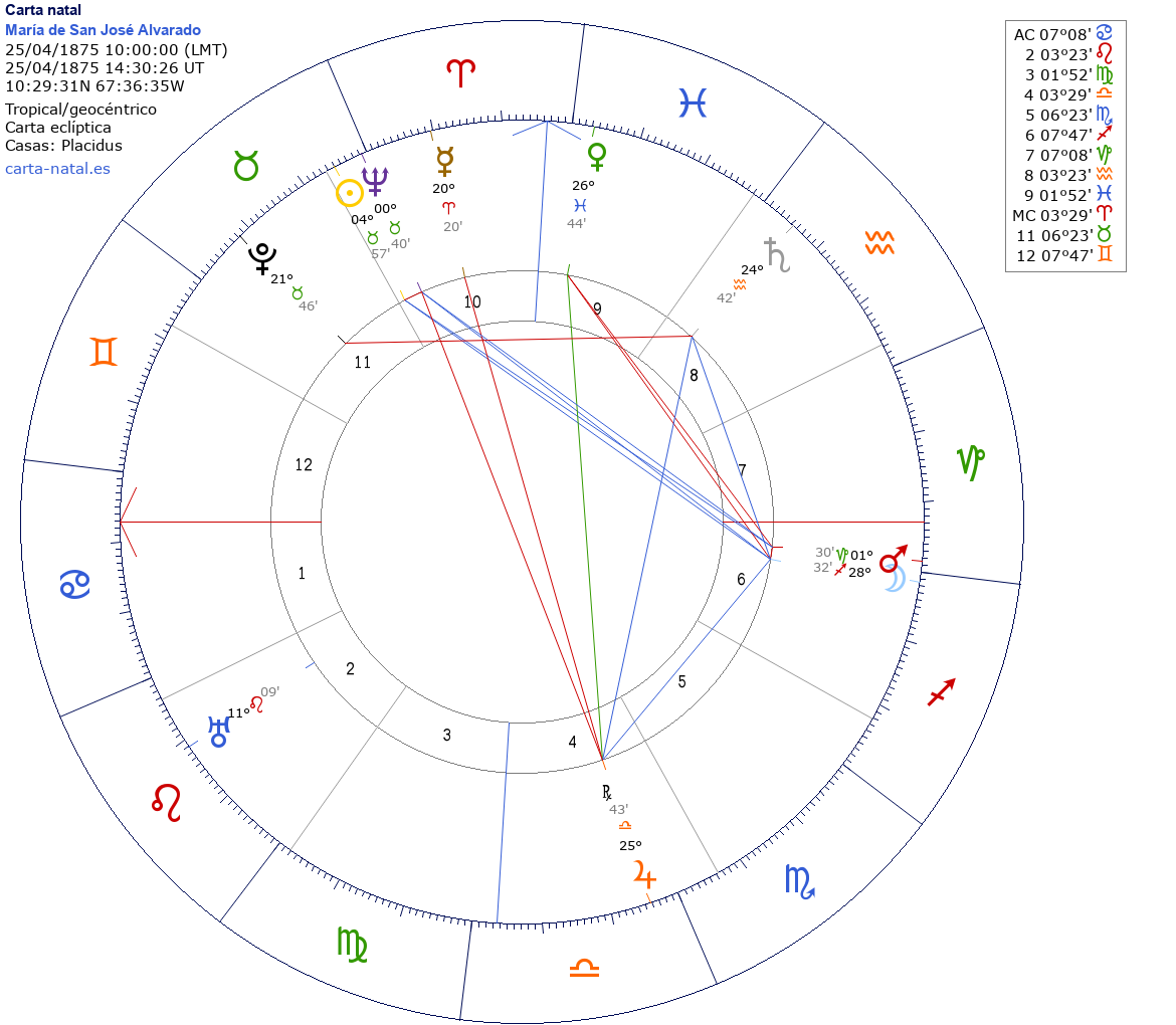 María de San José Alvarado nació el 25 de Abril de 1875 a las 10:00:00 en Choroni (Aragua), Venezuela