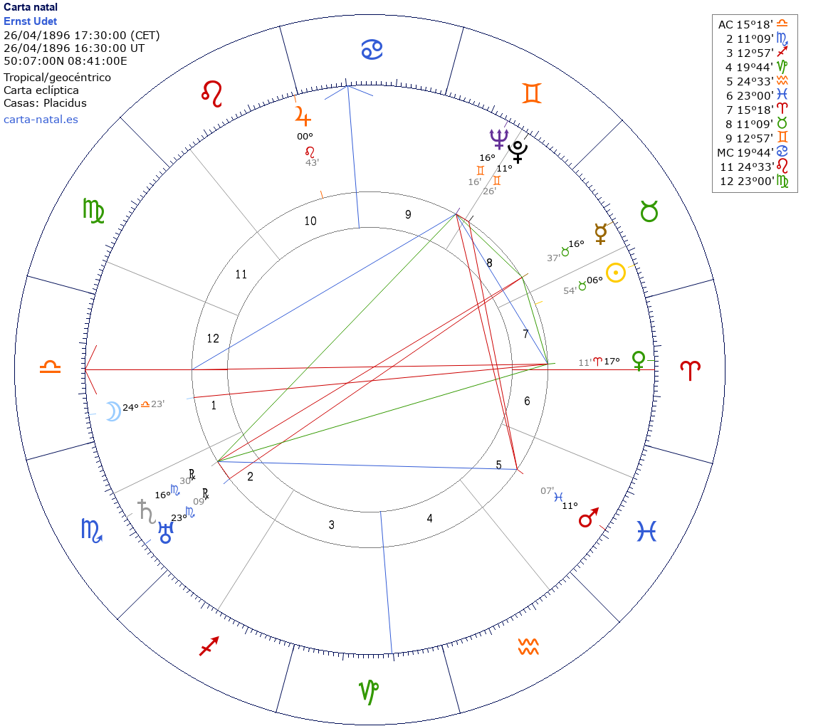 Ernst Udet nació el 26 de Abril de 1896 a las 17:30:00 en Frankfurt am Main (Hesse), Alemania
