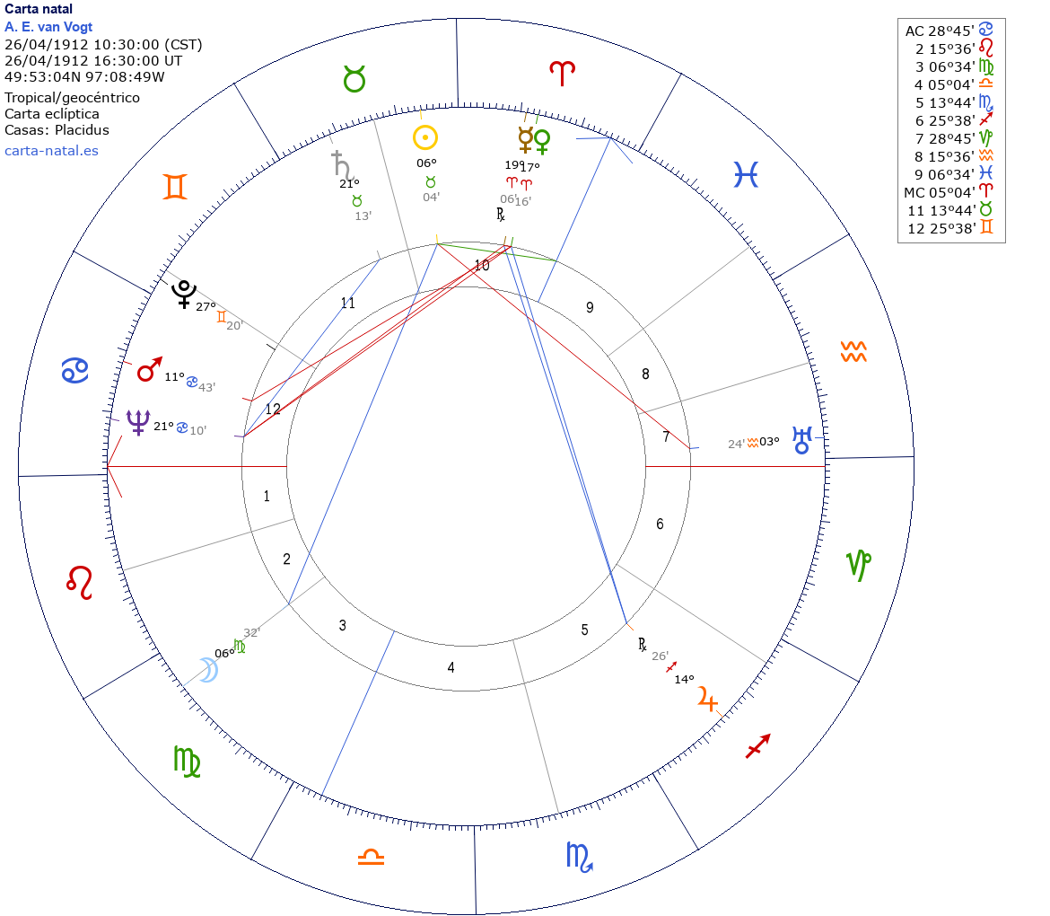 Esta es la carta natal de A. E. van Vogt, escritor de ciencia ficción estadounidense.