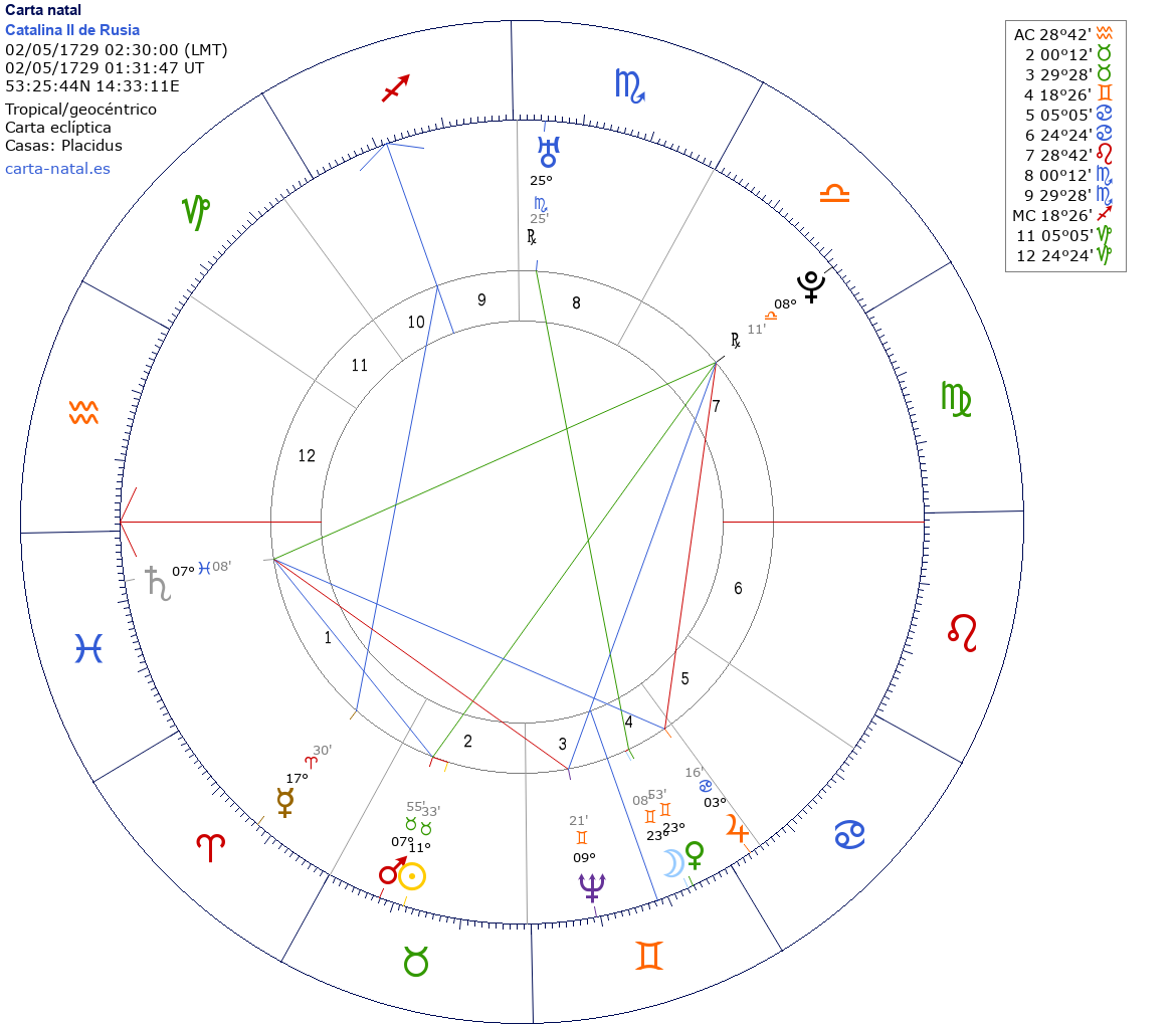Esta es la carta natal de Catalina II la Grande, zarina de Rusia.