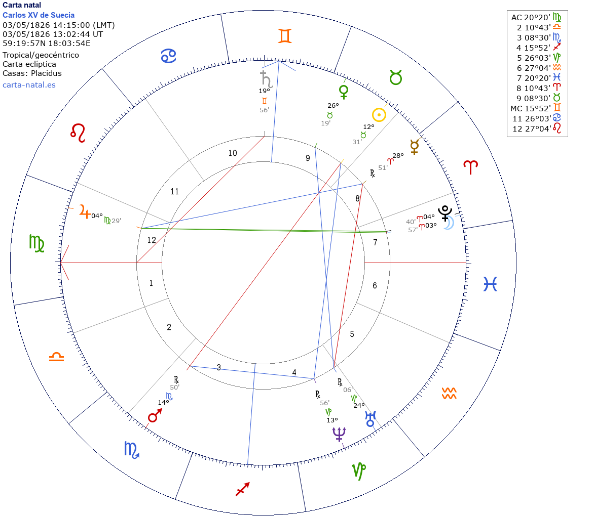 Esta es la carta natal de Carlos XV, rey de Suecia y Noruega (1859-1872).