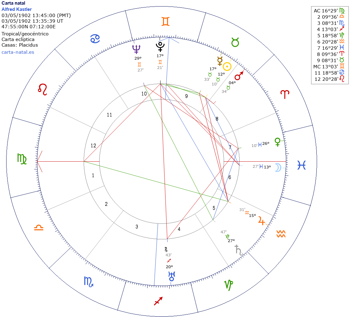 Esta es la carta natal de Alfred Kastler, físico francés desarrollador de la técnica de optical pumping y fundador de Acción Contra el Hambre, Premio Nobel de Física en 1966.