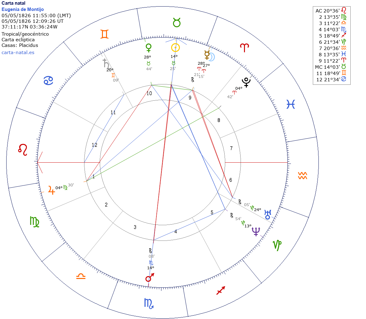 Eugenia de Montijo nació el 5 de Mayo de 1826 a las 11:55:00 en Granada (Granada), España