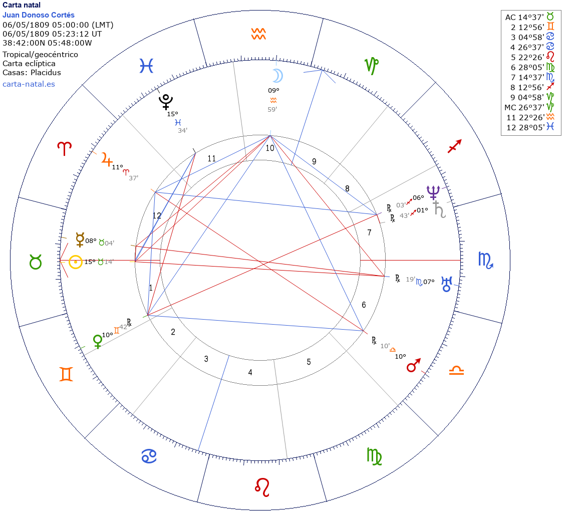 Juan Donoso Cortés nació el 6 de Mayo de 1809 a las 05:00:00 en Valle de la Serena (Badajoz), España