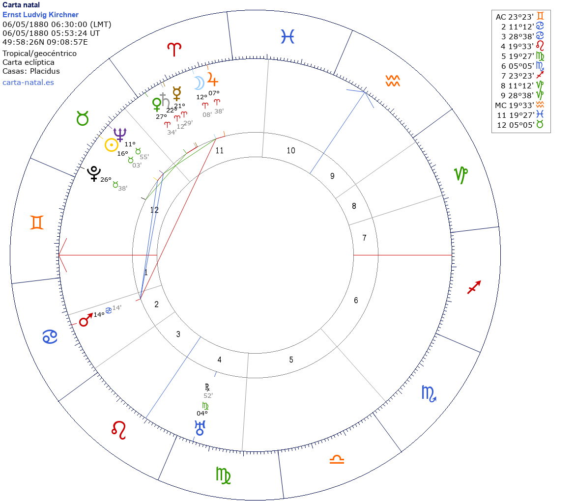 Ernst Ludvig Kirchner nació el 6 de Mayo de 1880 a las 06:30:00 en Aschaffenburg (Baviera), Alemania