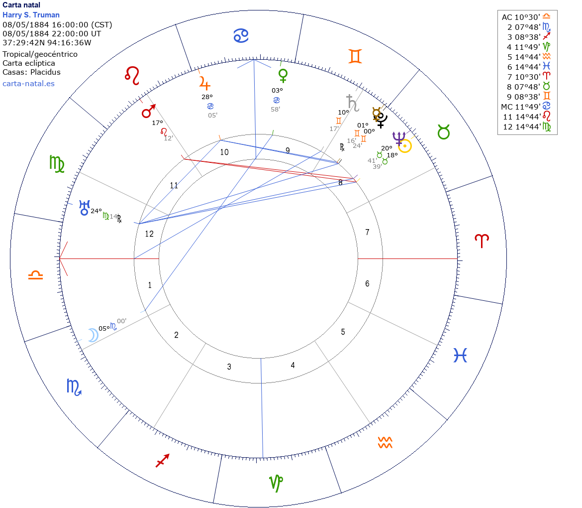 Harry S. Truman nació el 8 de Mayo de 1884 a las 16:00:00 en Lamar (Barton MO), Estados Unidos