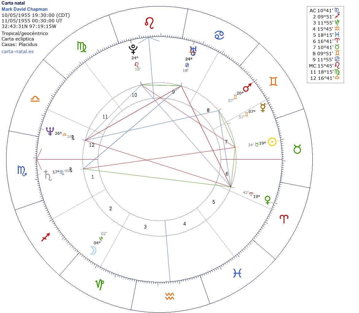Mark David Chapman nació el 10 de Mayo de 1955 a las 19:30:00 en Fort Worth (Tarrant TX), Estados Unidos