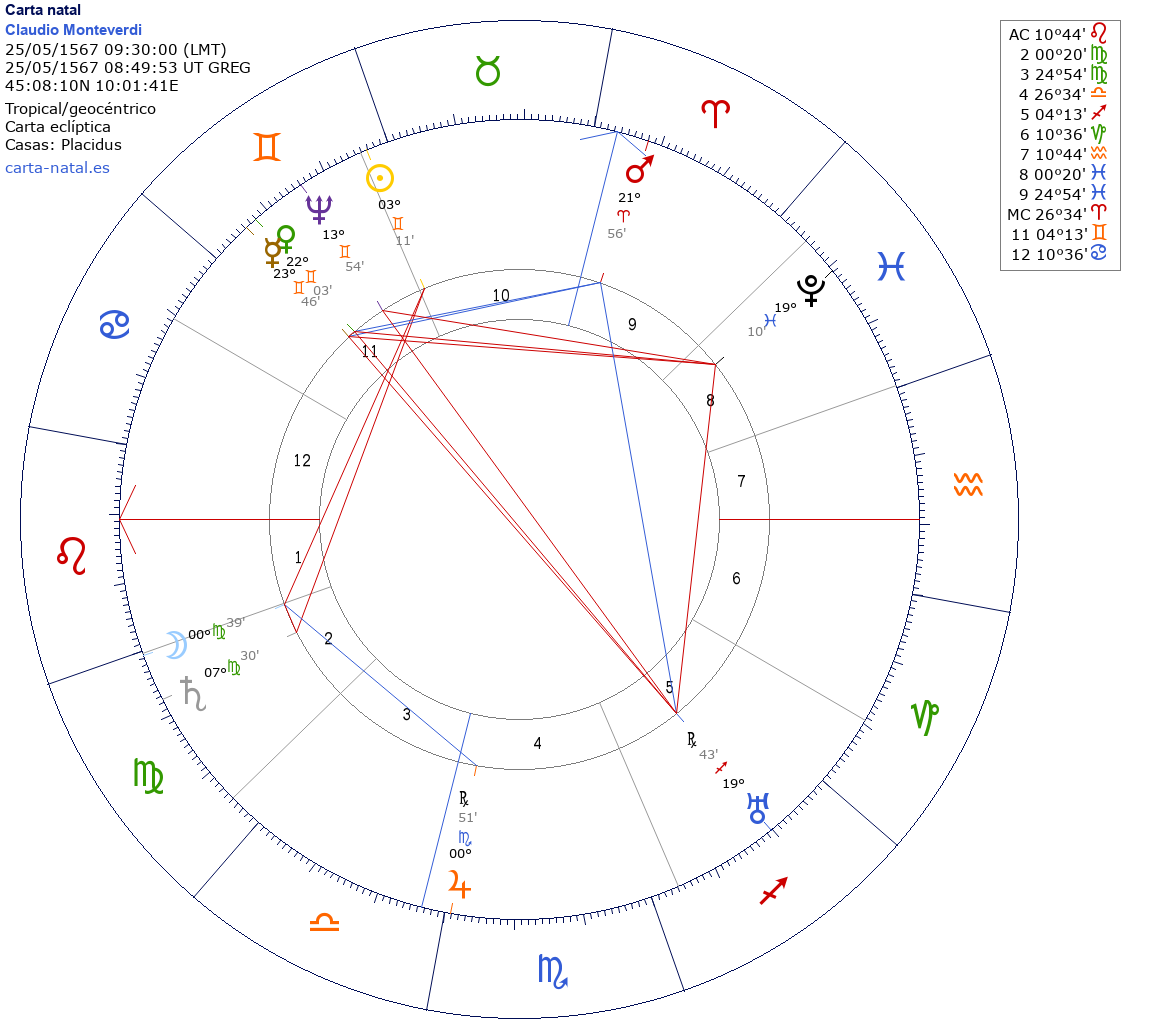 Esta es la carta natal de Claudio Monteverdi, compositor italiano.