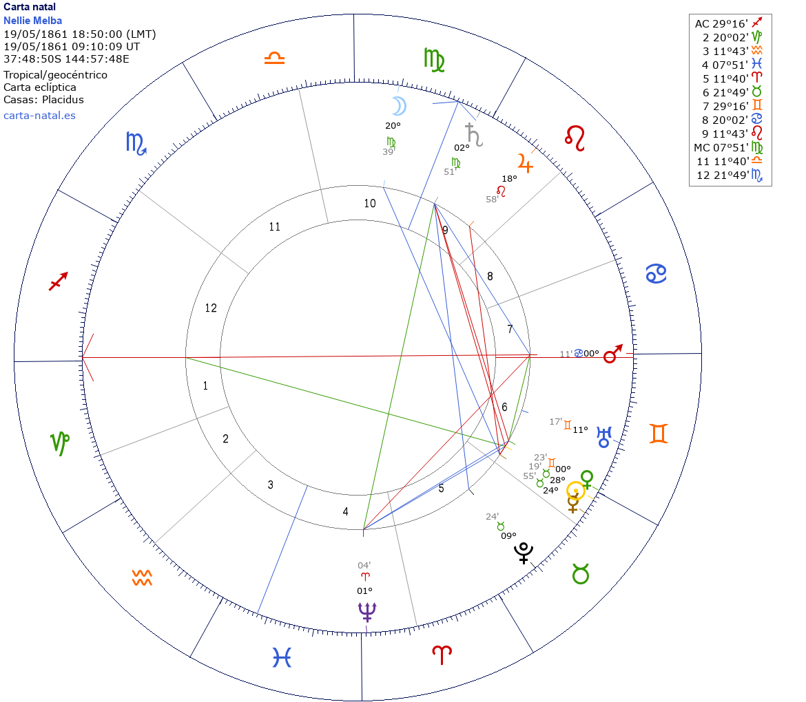 Esta es la carta natal de Nellie Melba, cantante de ópera australiana.