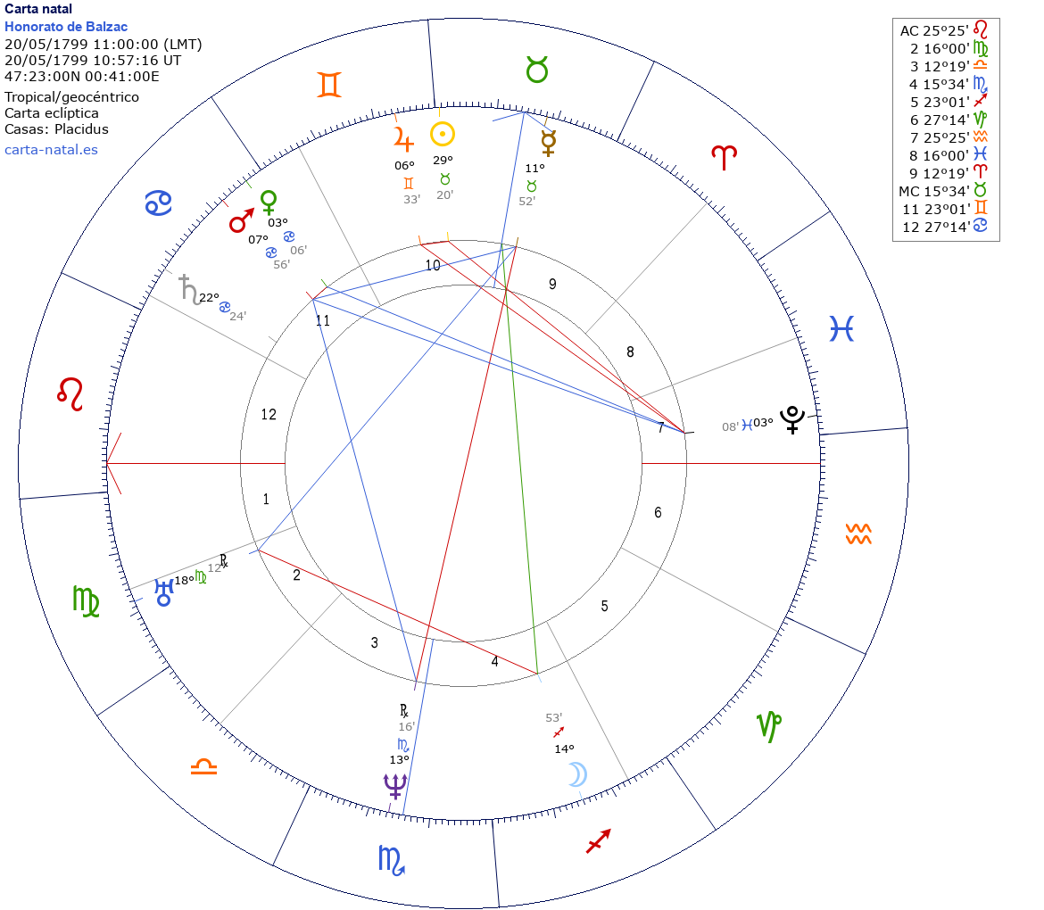 Honorato de Balzac nació el 20 de Mayo de 1799 a las 11:00:00 en Tours (Centro), Francia