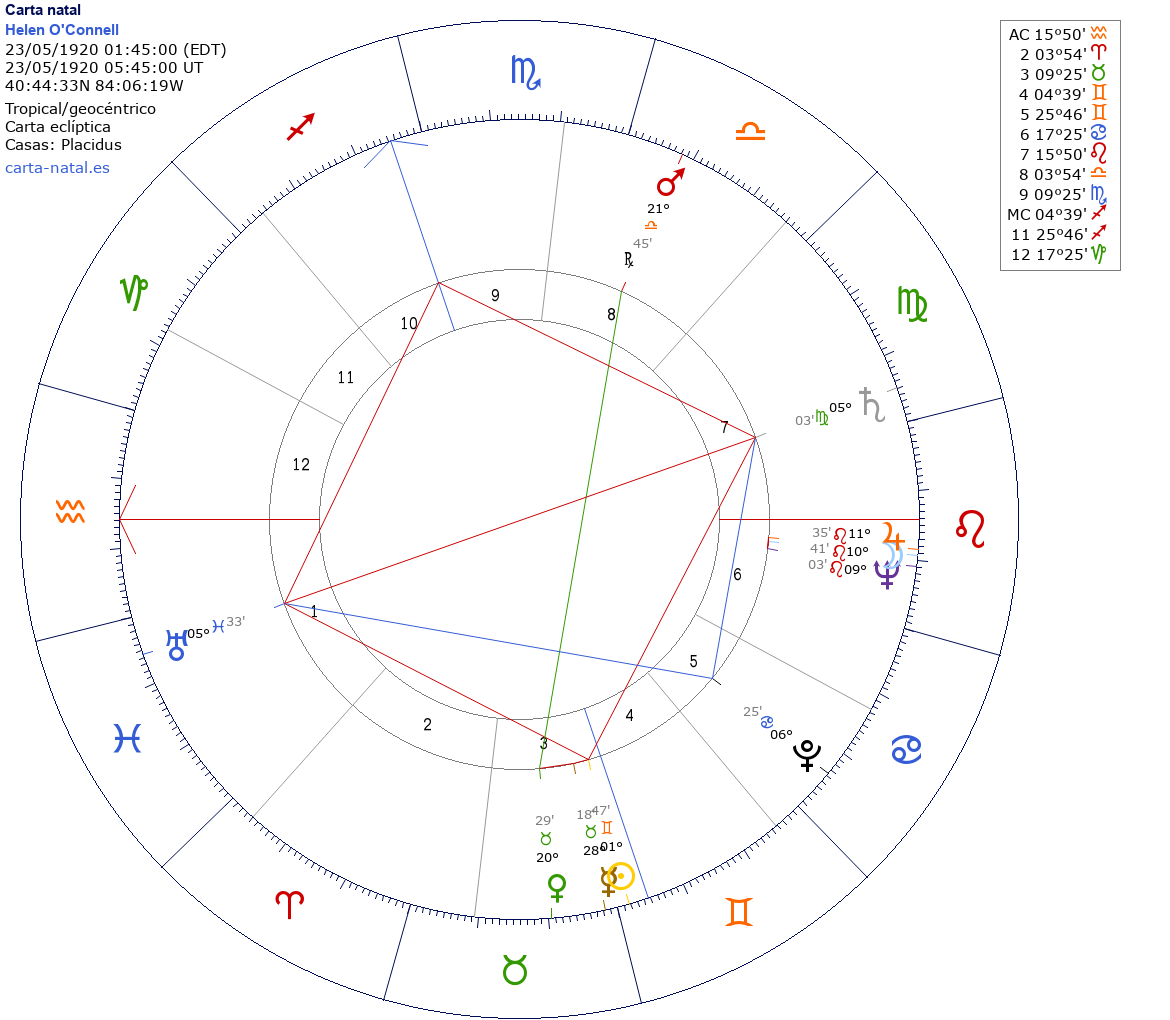 Esta es la carta natal de Helen O'Connell, cantante estadounidense.