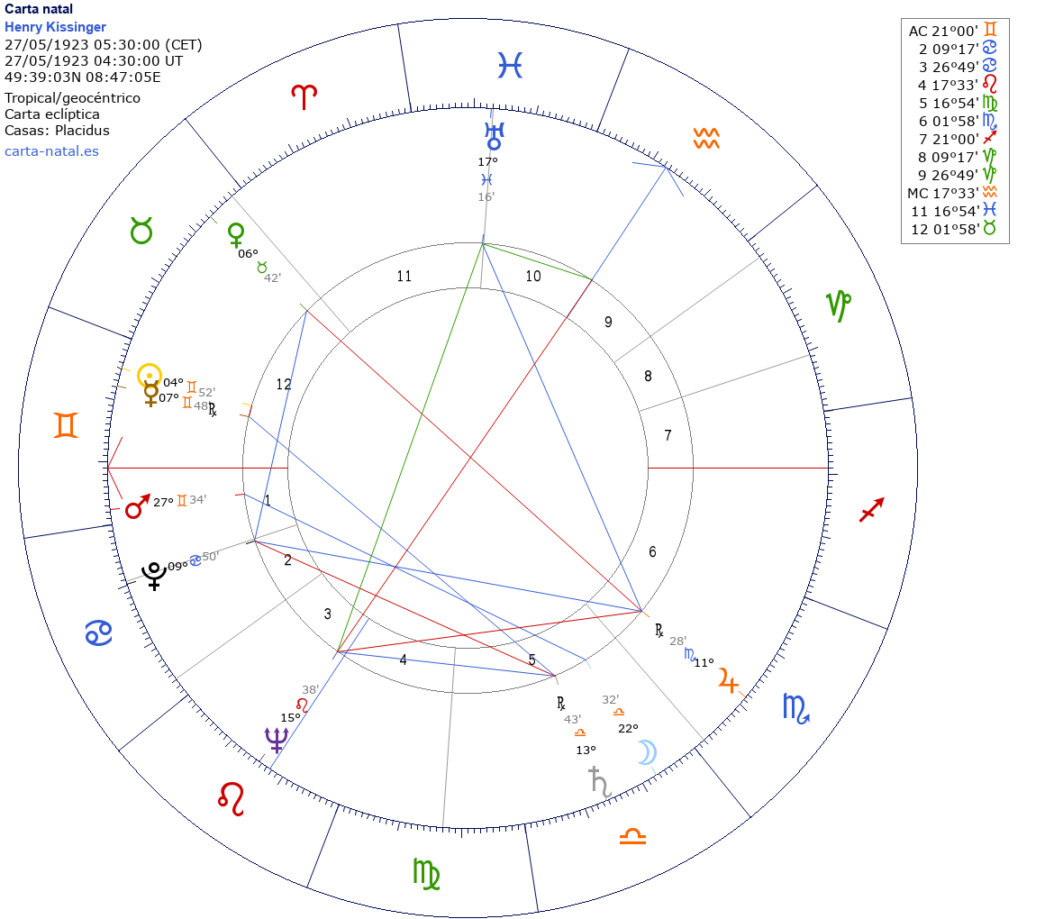 Esta es la carta natal de Henry Kissinger, político, académico y diplomático estadounidense nacido en Alemania, 56º Secretario de Estado, miembro del Club Bilderberg, Premio Nobel de la Paz en 1973.