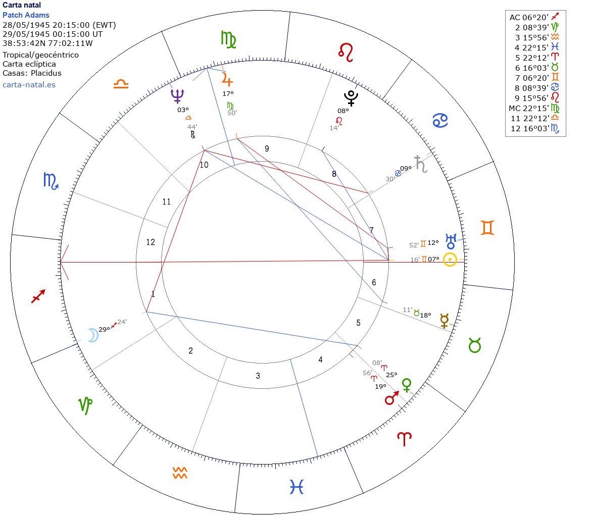 Esta es la carta natal de Hunter "Patch" Adams, doctor estadounidense.