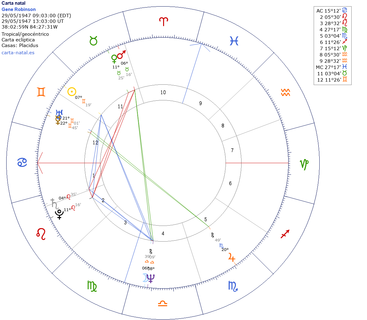 Gene Robinson nació el 29 de Mayo de 1947 a las 09:03:00 en Lexington-Fayette (Fayette KY), Estados Unidos