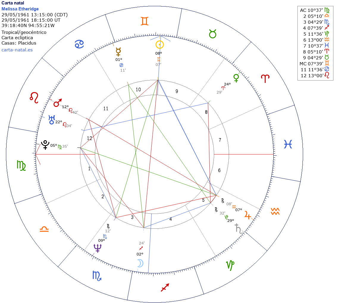 Esta es la carta natal de Melissa Etheridge, cantante estadounidense.