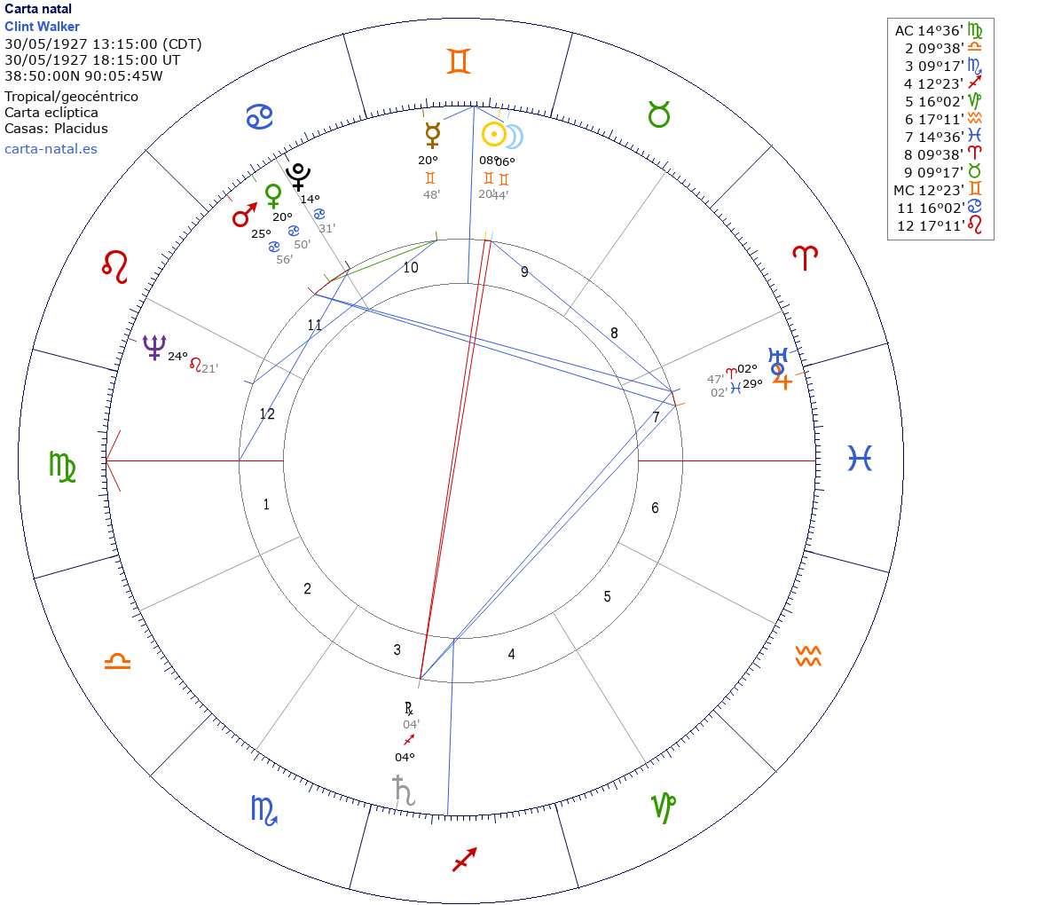 Esta es la carta natal de Clint Walker, actor estadounidense.