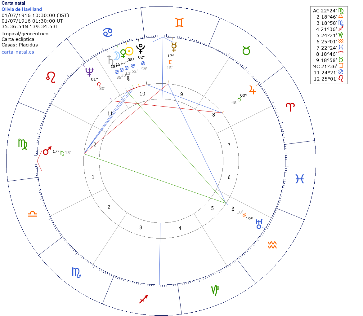 Esta es la carta natal de Olivia de Havilland, actriz estadounidense.