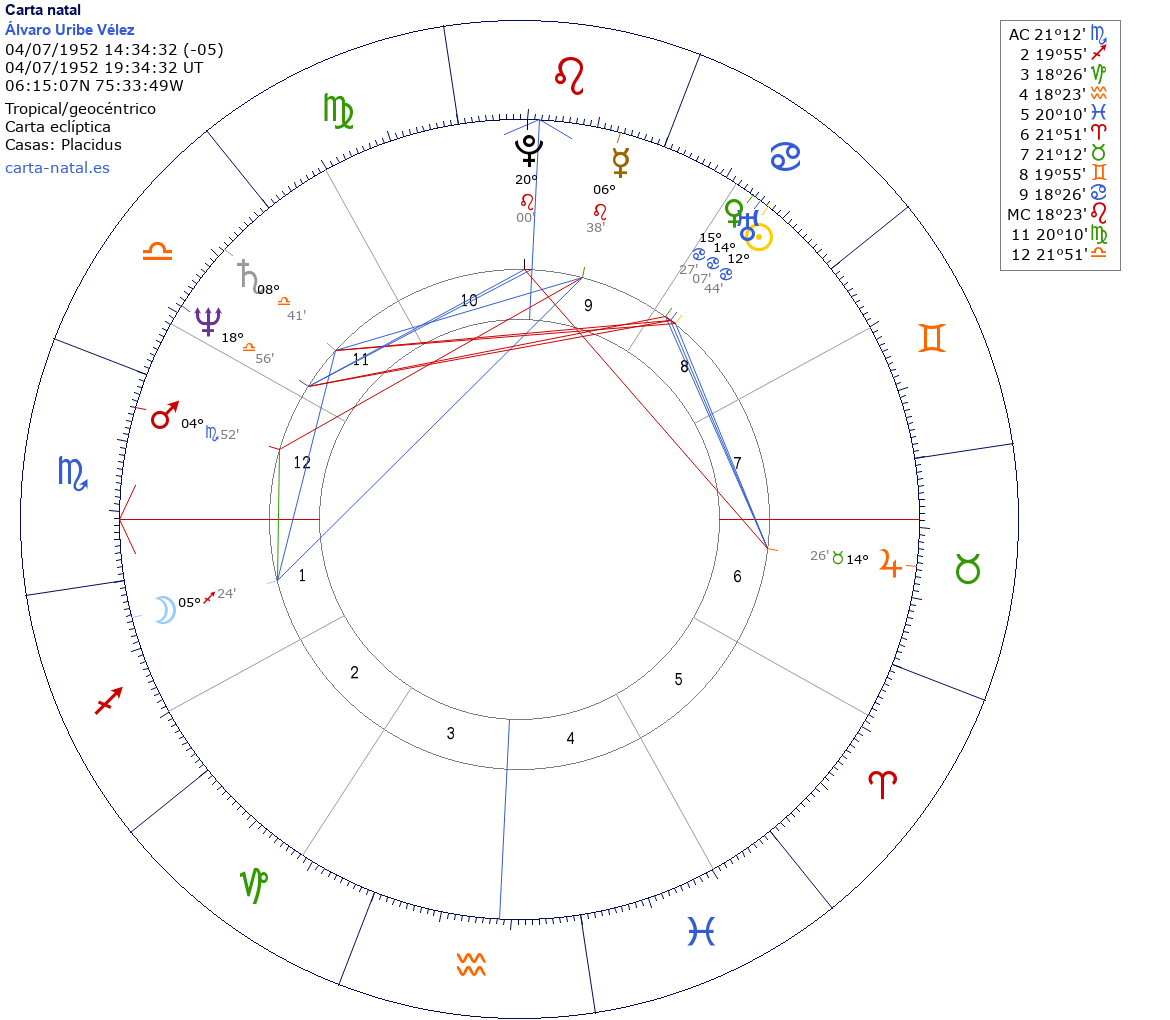 Esta es la carta natal de Álvaro Uribe Vélez, presidente de Colombia desde 2002.