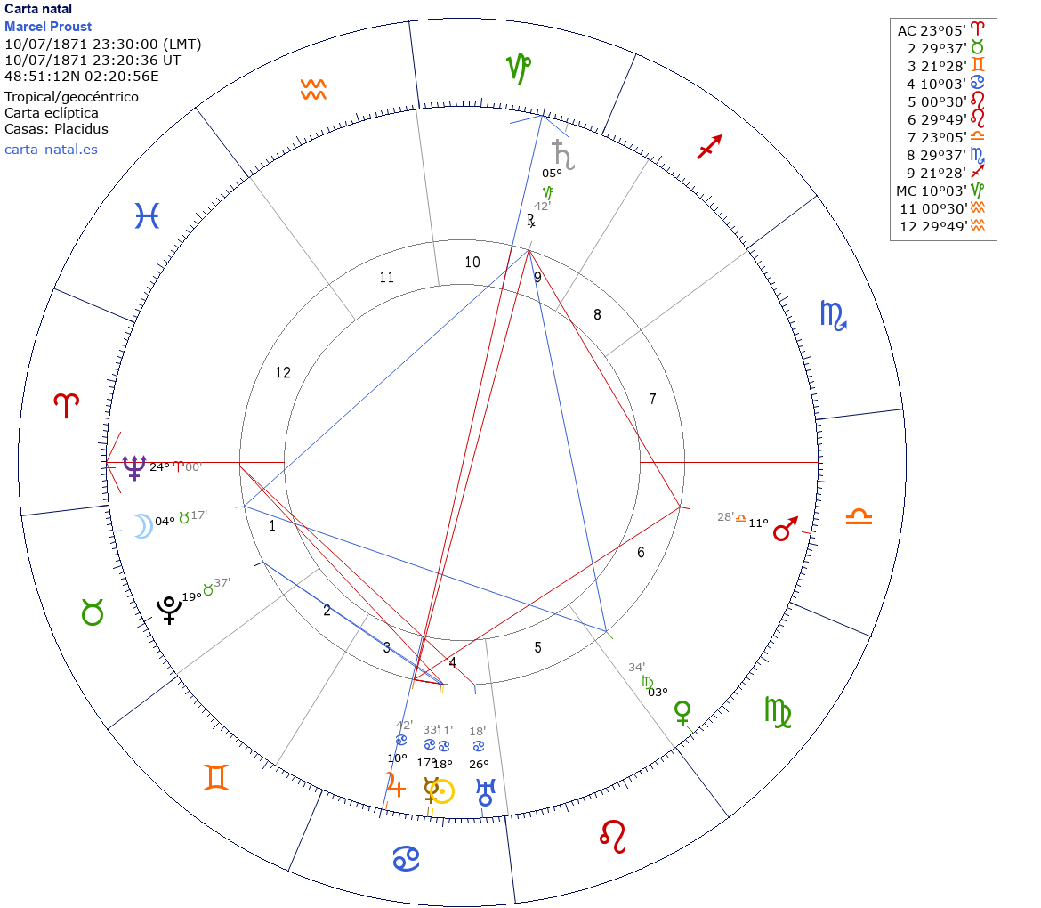 Marcel Proust nació el 10 de Julio de 1871 a las 23:30:00 en Paris (Isla de Francia), Francia