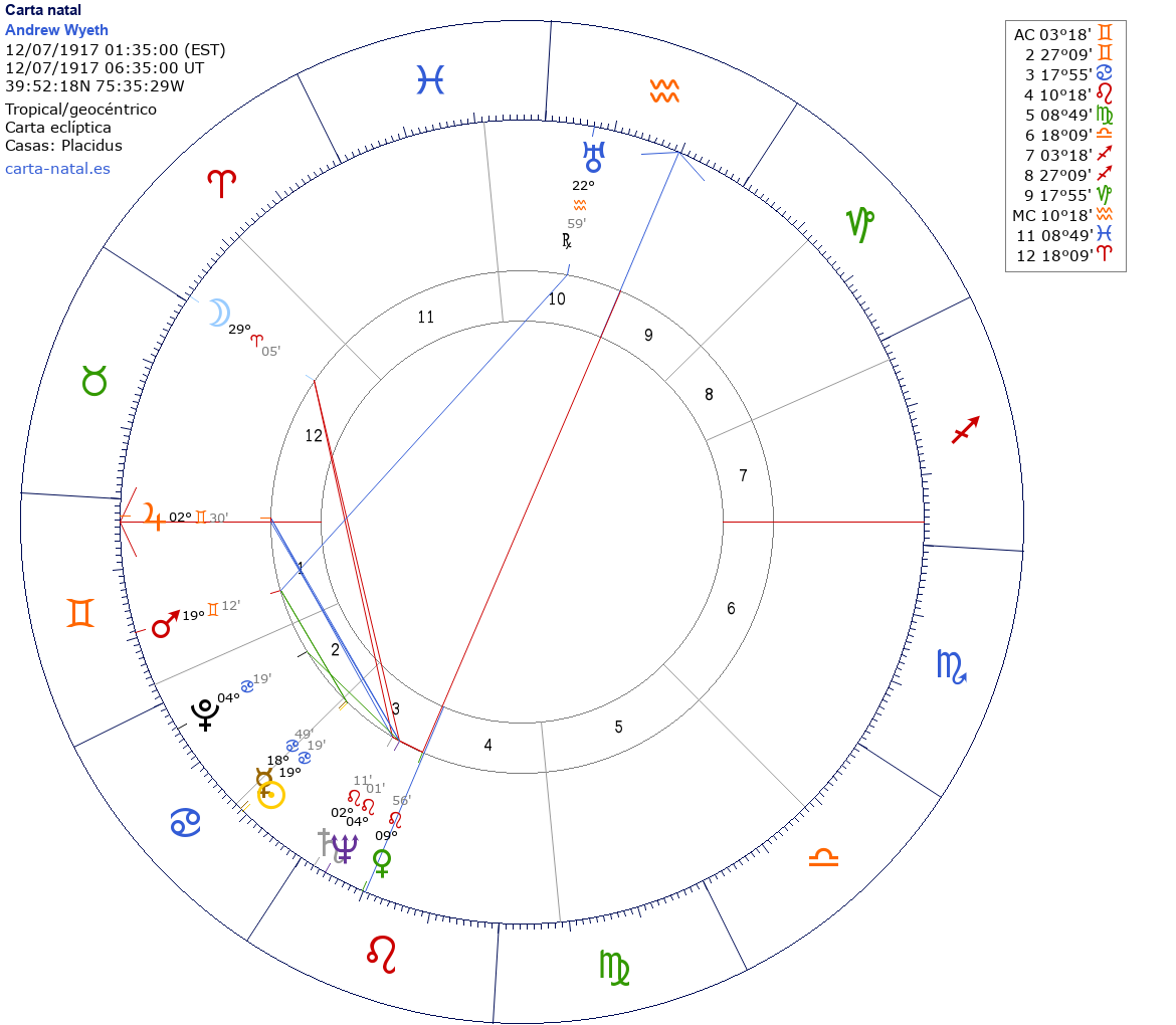 Andrew Wyeth nació el 12 de Julio de 1917 a las 01:35:00 en Chadds Ford (Delaware PA), Estados Unidos