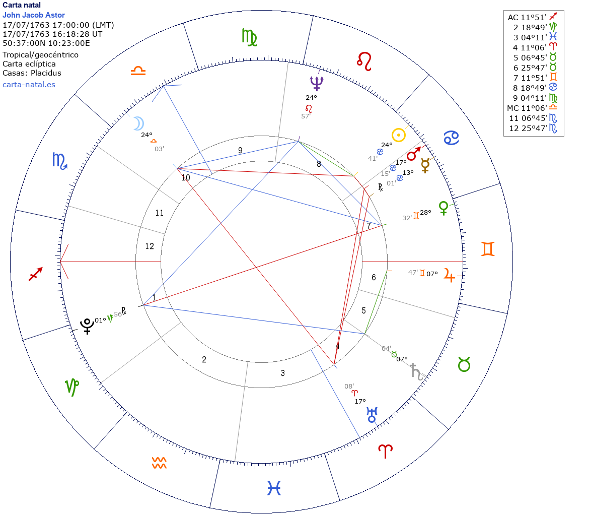 John Jacob Astor nació el 17 de Julio de 1763 a las 17:00:00 en Walldorf (Turingia), Alemania