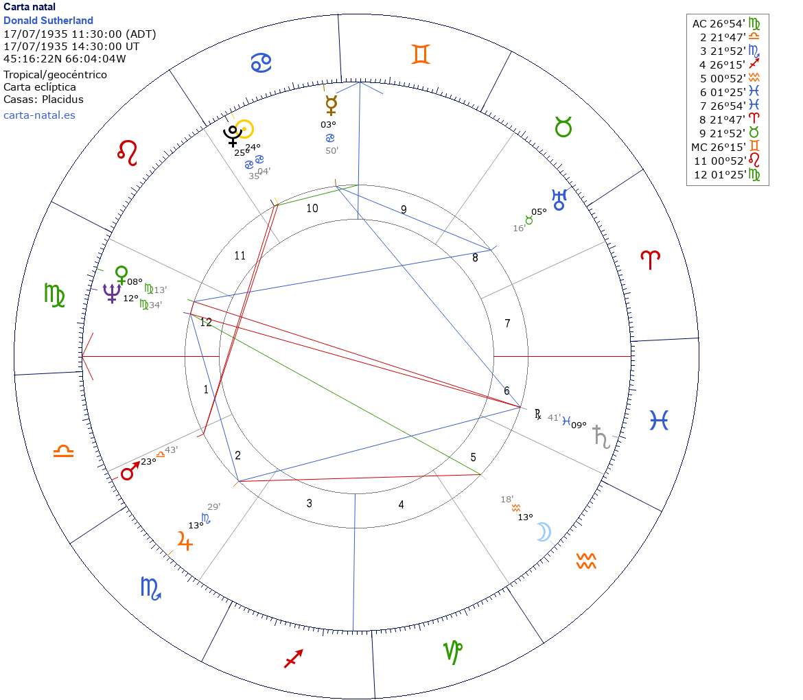 Esta es la carta natal de Donald Sutherland, actor de cine canadiense.
