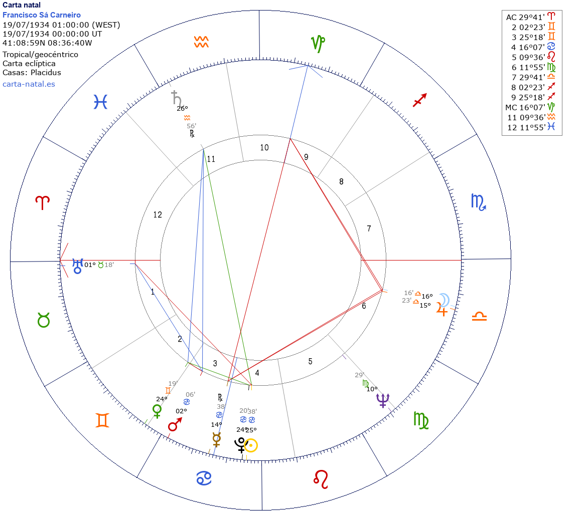 Esta es la carta natal de Francisco Sá Carneiro, primer ministro de Portugal (m. 1980).