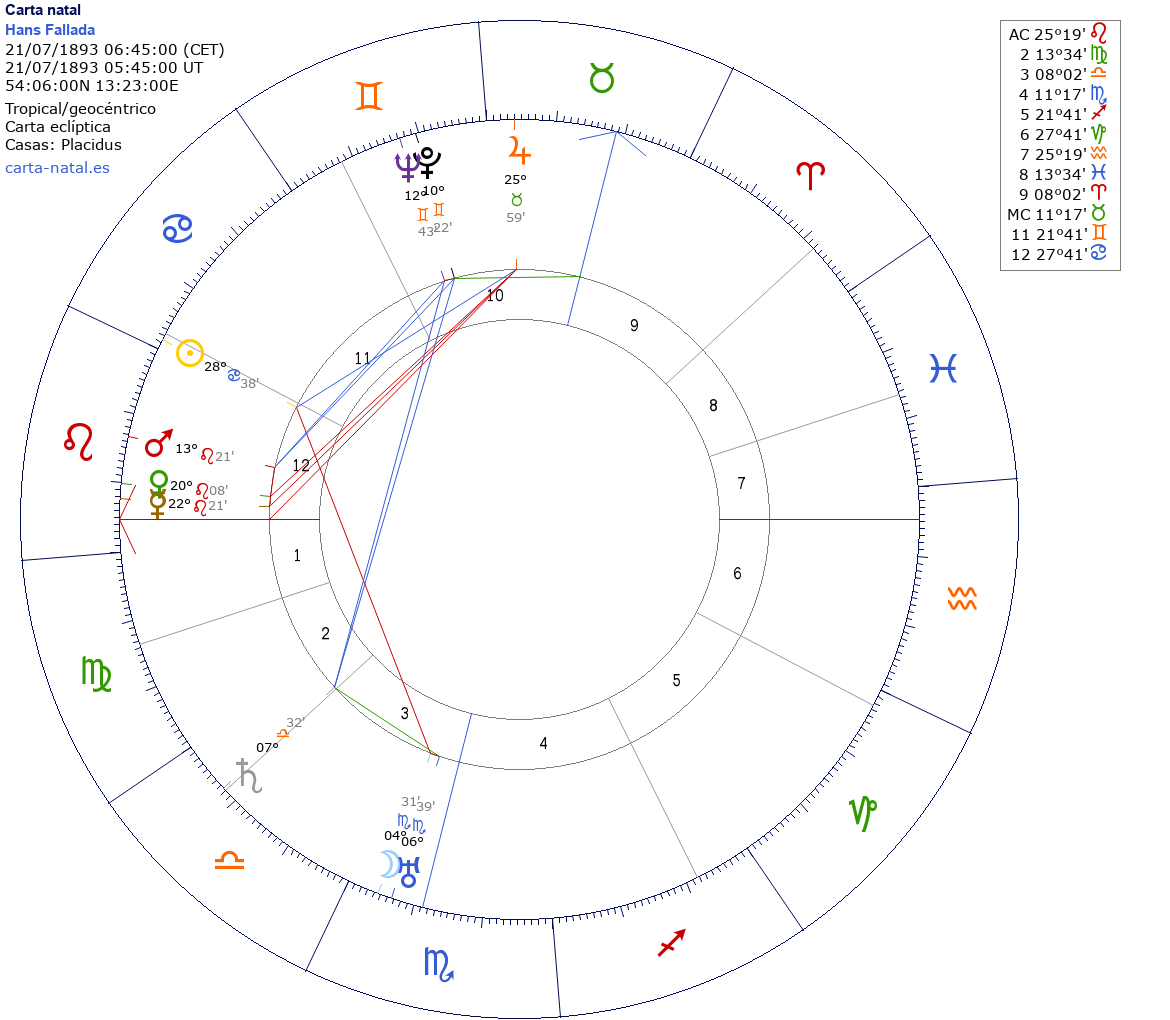 Hans Fallada nació el 21 de Julio de 1893 a las 06:45:00 en Greifswald (Mecklemburgo-Pomerania Occidental), Alemania