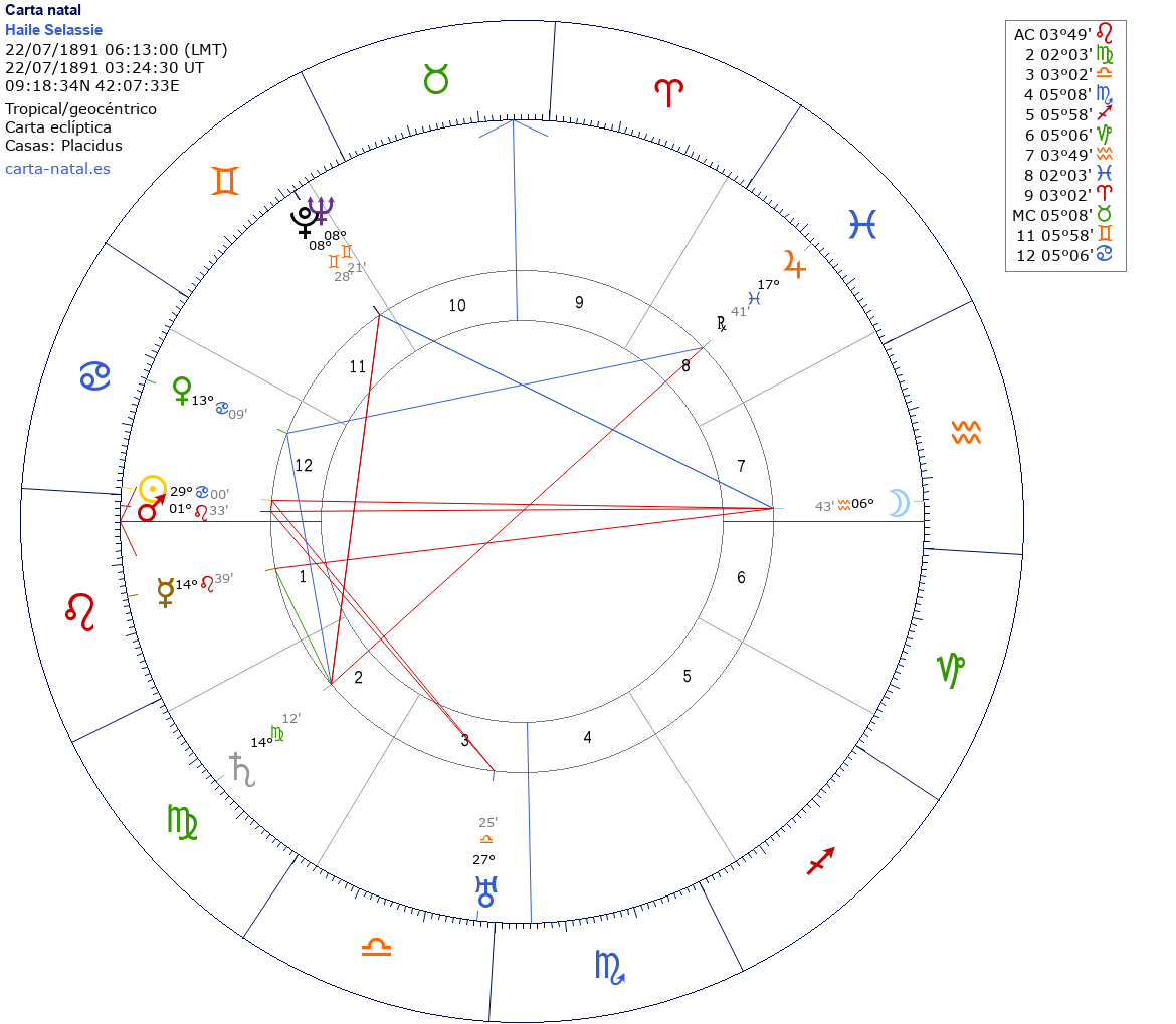 Esta es la carta natal de Haile Selassie, emperador etíope (1930-1974).