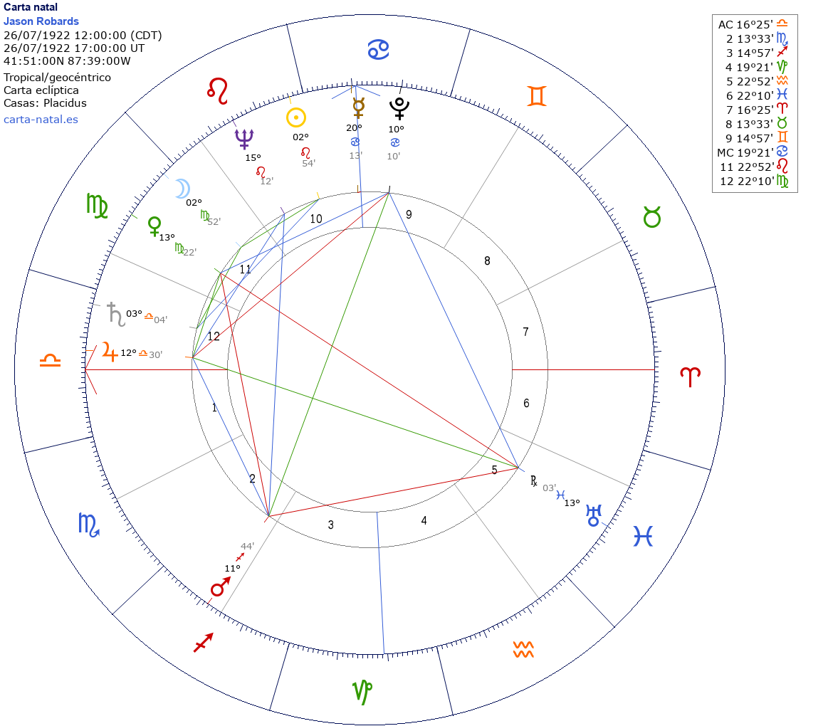 Esta es la carta natal de Jason Robards, actor de cine estadounidense.
