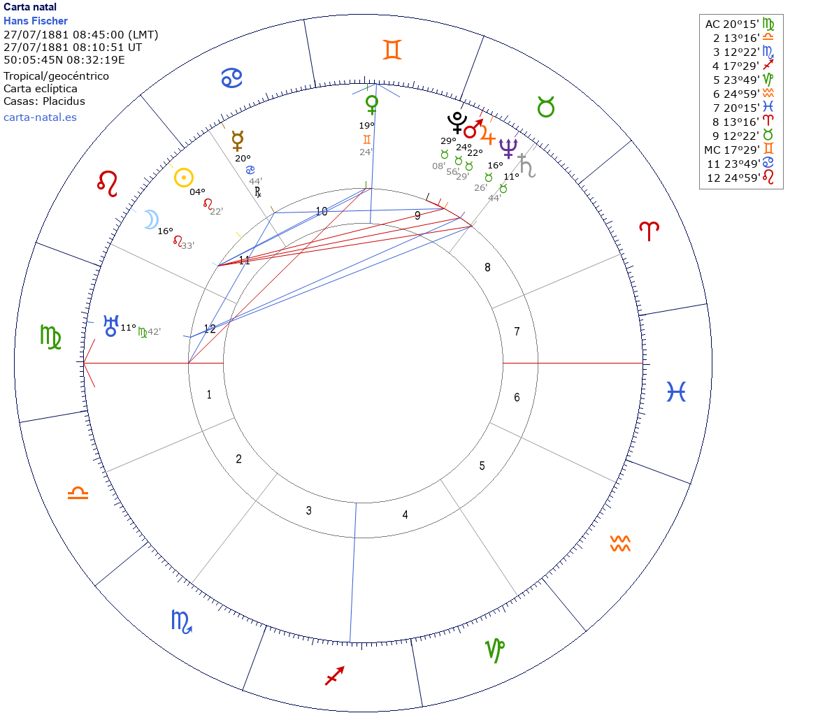 Esta es la carta natal de Hans Fischer, químico y médico alemán, Premio Nobel de Química en 1930, Medalla Davy en 1937.